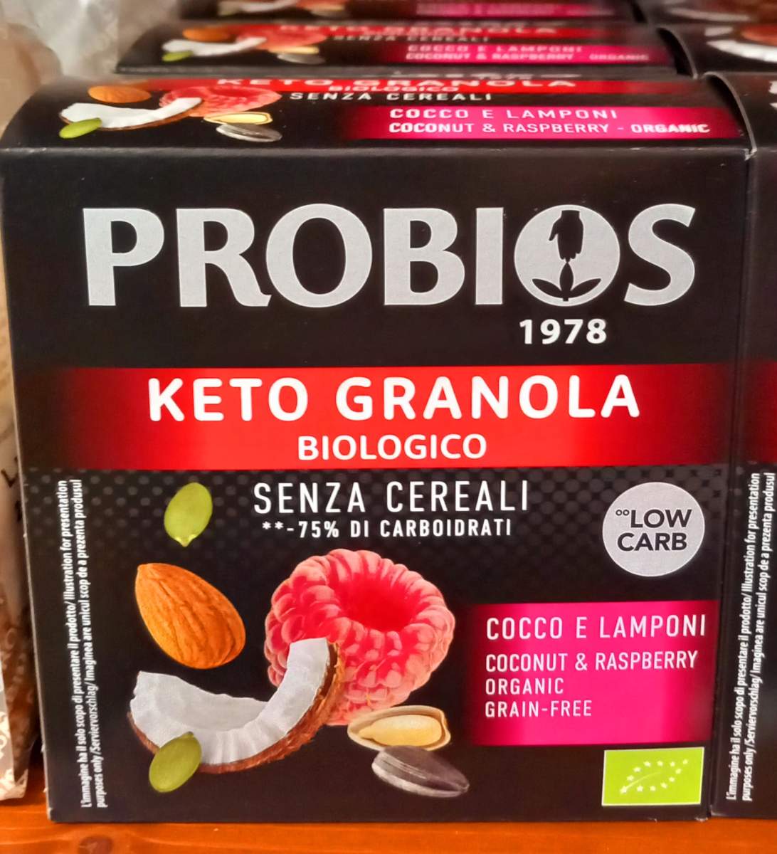 *cocco in scaglie 35,5%, *semi di zucca 12,5%, *semi di girasole 12,5%, *semi di lino, *MANDORLE 10,4%, edulcorante: *eritritolo, *olio di cocco 5,2%, *lamponi liofilizzati 2,6%, aroma naturale di mirtillo, antiossidanti: *estratto di rosmarino, aroma naturale di mora. *Biologico.