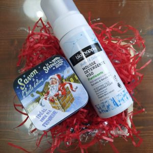 Cestino benessere: – Confezione in latta con all\’ interno una saponetta arancia e cannella con olio d\’ oliva – detergente viso purificante in mousse Entrambi i prodotti sono bio.